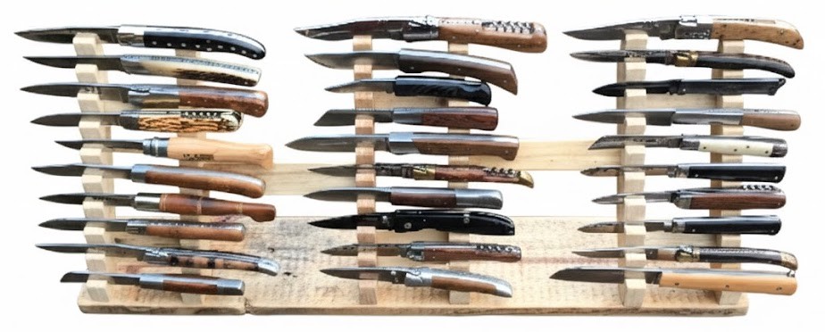 Supports en bois façonnés à la main pour couteaux et fusils d’exception.